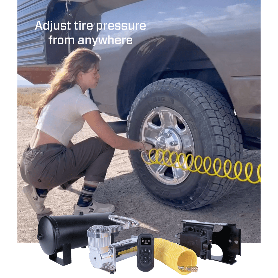 The WirelessAir Tank + EZ Mount kit (PN 74100EZ) offers a 2-gallon auxiliary air tank and convenient wireless control, providing on-the-go adjustability and an easily accessible air supply wherever you need it.
