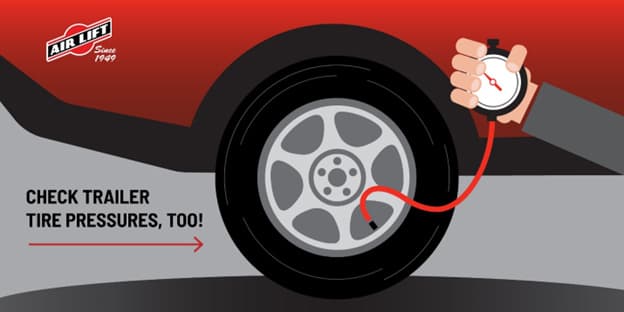 Checking your tire pressure sounds simple, and despite modern cars being equipped with tire pressure monitoring systems (TPMS), most trailers do not have TPMS. It is imperative to check tire pressures on both your tow vehicle and trailer before setting off. Trailer tires are unique, and they often require significantly higher pressures than a car– high enough that many gas station air compressors are not sufficient. It may be necessary to take your trailer to a tire shop and ask them to fill your tires to the proper specification or purchase your own high-powered air compressor. If your trailer tires are underinflated, your load carrying capacity diminishes.